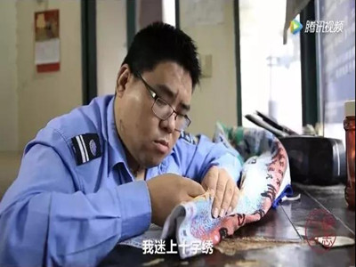 杭州市东园小区的保安沈涛,五年前因为和朋友打赌迷上十字绣,从此一发不可收拾。