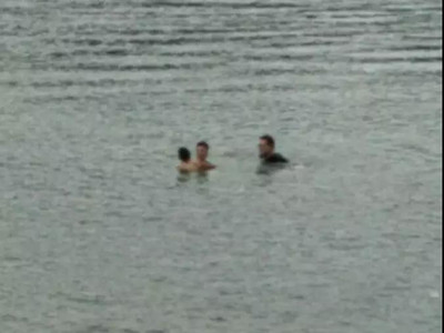 ▲叶芳强(中)正在营救溺水儿童,旁边为一起游过来地方青年,他因腿抽筋最后游回岸边