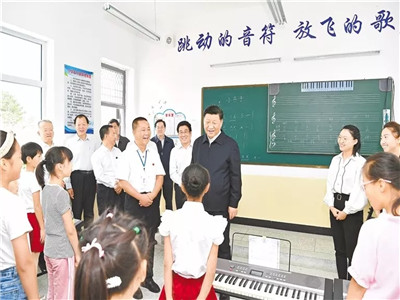8月19日至22日,中共中央总书记、国家主席、中央军委主席习近平在甘肃考察。这是21日上午,习近平在武威市古浪县黄花滩生态移民区富民新村富民小学的音乐教室,认真观看正在进行的音乐课教学。新华社发