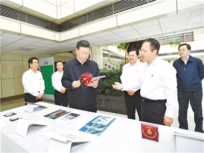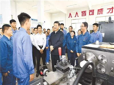 8月19日至22日,中共中央总书记、国家主席、中央军委主席习近平在甘肃考察。这是20日下午,习近平在张掖市山丹培黎学校现代制造技术实训室,观看职业技能实训,同师生亲切交流。新华社发