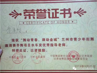 本网讯(记者 李宏丹 通讯员 李泽阳 周芸)9月21日,由共青团兰州市委、兰州市教育局、兰州市青年联合会主办,中国舞协街舞委员会甘肃联盟、甘肃省舞协街舞委员会承办的首届“舞动青春·律动金城” 兰州市青少年街舞邀请赛在兰州大学举行。兰州成功初中分校Power街舞社团代表队在齐赛项目决赛中表现出色,荣获“水车奖”,李泽阳老师荣获“优秀指导老师”。