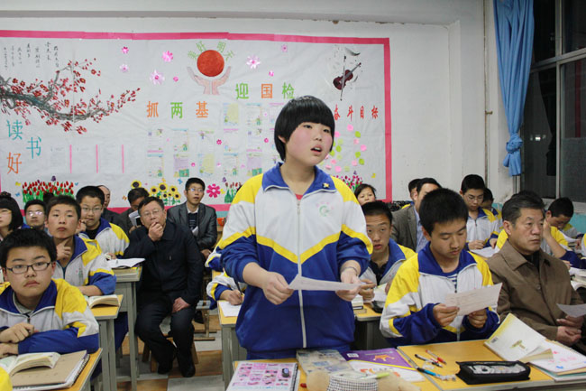 当晚晚自习时分,学校在初二一班和初二二班分别进行了语文和数学的示范教学,参加此次教学的有总校领导、张校长以及各科任课教师。在初二一班,由吴步健老师按照创新“导学案”讲解语文课程《五柳先生传》,先给学生发放导学案,让学生带着问题学习文章,之后对他们进行提问,检查学习效果,再根据学生的掌握程度进行讲解,充分发挥了学生学习的能动性,效率很高。在初二二班,由高转平老师对数学课程进行创新教学,课堂气氛活跃,教学效果很好。