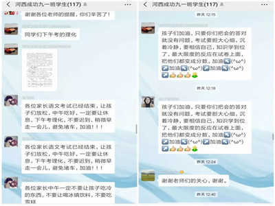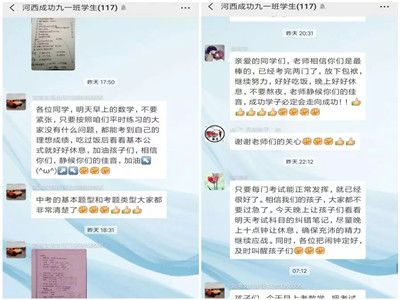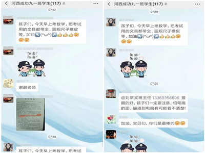 考前与考时,河西成功学校初三年级各班级群里留下了成功老师们细心的叮嘱和衷心的祝福,家长、学生们连声感谢。